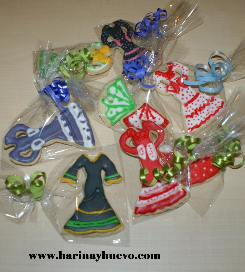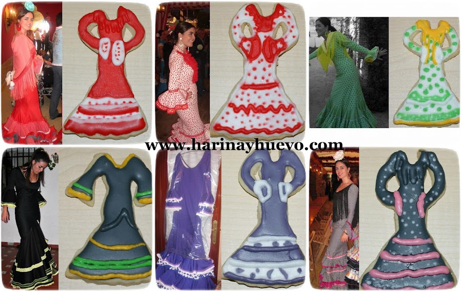 Ya sé que aún queda un poquito para feria pero hace tiempo hice estas galletas para mi amiga Claudia del blog Entre Cirios y Volantes. Llevaba mucho tiempo diciéndole que tenía una idea especial para hacerle una tarta, pero como vivimos en ciudades a 500km de distancia pues me resultaba un poco difícil llevársela. Así que cambié la idea ¡las galletas sí las puedo llevar! como ella hace trajes de flamenca, busque en su blog trajes suyos y le hice una galleta imitando a cada modelo. Sé que ella tiene muchos más pero estos son los que encontré. ¿qué os parece?