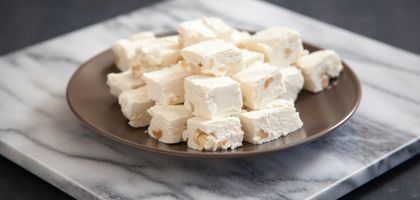 En una olla colocar azúcar y agua dejar formar un almíbar,ya listo aparte del calor coloque la miel de abejas revolver,bata las claras a punto de nieve,incorporar el almíbar por chorrito batir hasta tocar el tazón este frío,agregar las almendras y verter a un molde cubrir con plástico de cocina y refrigerar unas 4 a 5 horas mínimo antes de desmoldar,cortar y servir.