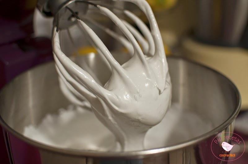 Una vez que esté templada batimos la mezcla con unas varillas eléctricas,veréis que al batir se empieza a poner blanca y va cogiendo apariencia de merengue.Si usáis unas varillas de mano,eléctricas claro,tardara en montarse unos 10 minutos.Si por el contrario usáis una Kitchen Aid o similar tardara en montar de 5 a 7 minutos a velocidad alta (8).