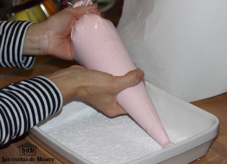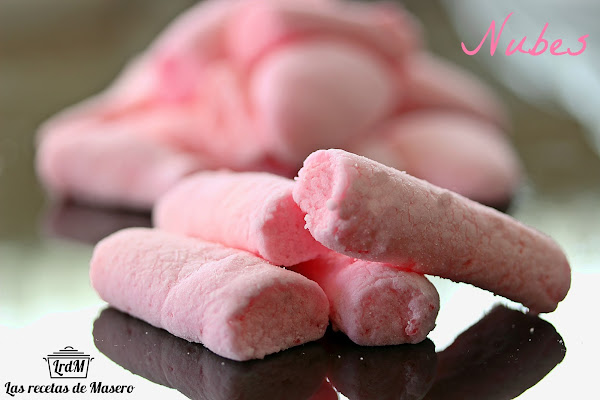 Nota: En el caso de que no dispongáis de manga pastelera forraremos una bandeja con papel film espolvoreado de azúcar glass. Verteremos la mezcla y dejaremos solidificar. Despegamos la mezcla en un solo bloque y la partimos en cuadraditos con un cuchillo afilado o bien le damos la forma que nos guste con nuestro cortapastas favorito. Las metemos en una bolsa de plástico con abundante azúcar Agitamos bien la bolsa para que las nubes se impregnen con el azúcar glas y así no se peguen unas a otras.