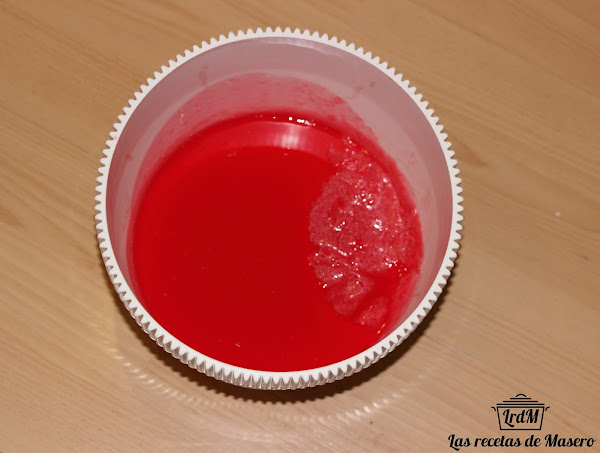 Calentamos el agua en un cazo. Cuando el agua esté caliente añadimos el azúcar y la gelatina neutra.Una vez bien disuelta la gelatina incorporamos el sobre de la gelatina de fresa y el azúcar vainillado.