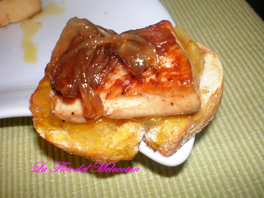 Finalmente ponemos el foie sobre la mermelada, y encima la cebolla caramelizada y sal gorda.