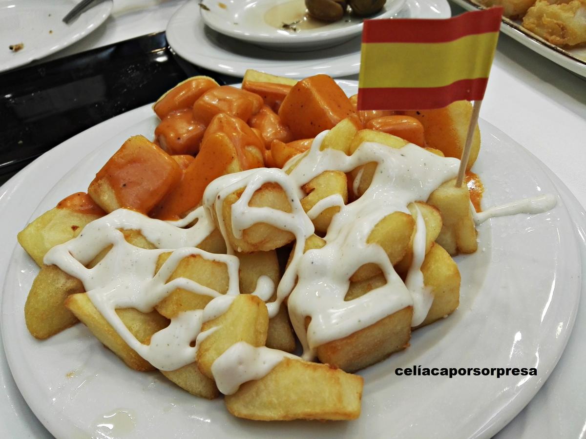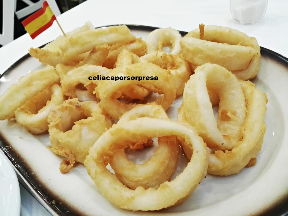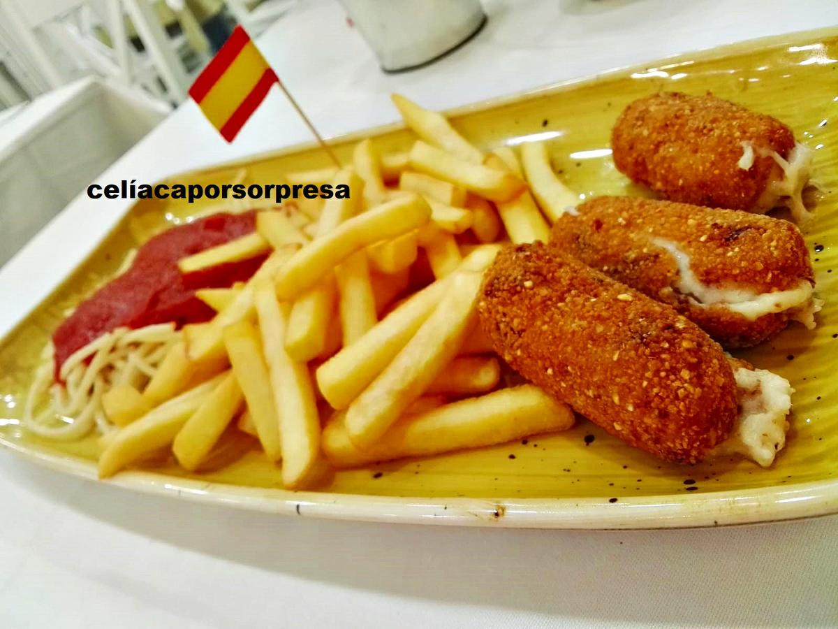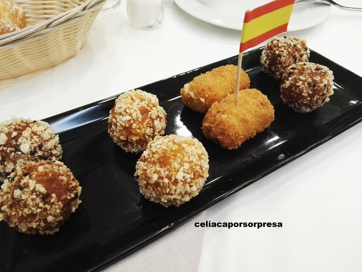Aquí podéis ver los platos, todos sin gluten tal y como indica la banderita de España, de bravioli, de calamares a la andaluza y el mix de croquetas.