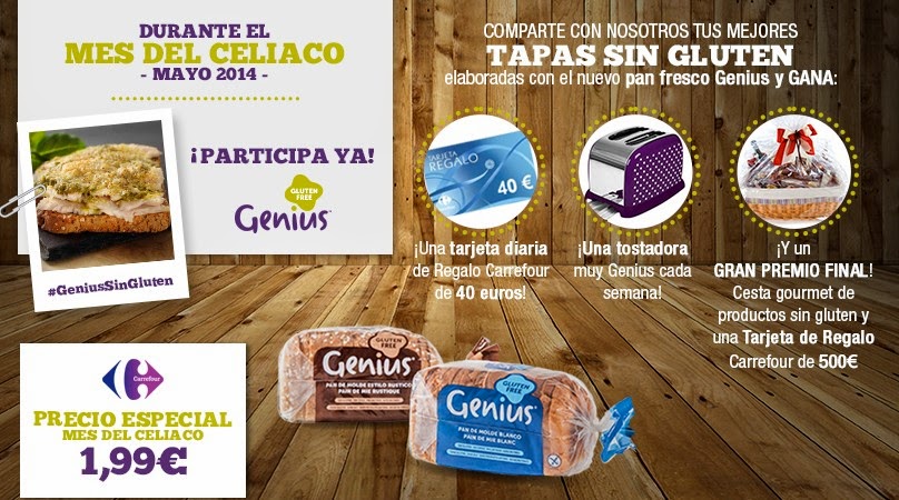 Aunque la calidad de este pan y su precio de promoción ya son motivo suficiente para hacerse con él, además, durante este mes GENIUS reparte premios a diario en su CONCURSO DE TAPAS SIN GLUTEN. Entra en su página de facebook, y entérate de cómo hacerlo. Es tan sencillo como hacerte fan de su página y publicar la foto de tu tapa sin gluten. :)