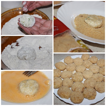Sacamos porciones , hacemos bolitas , las aplastamos un poco y las rebozamos primero en harina, luego en huevo batido y por último en la picada para rebozar o en su defecto en pan rallado.