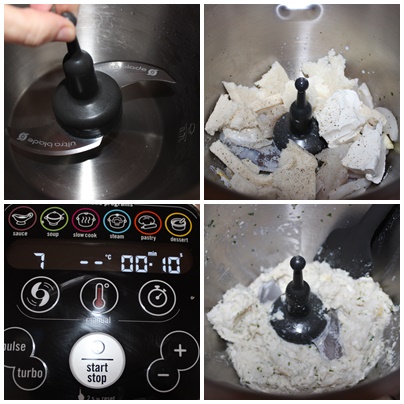 Ponemos en la cubeta de la Cuisine Companion, la cuchilla amasar -picar, añadimos el ajo y el perejil , añadimos el pescado troceado, el queso, el pan , la leche, pimienta y sal.