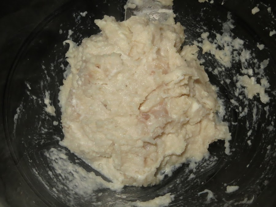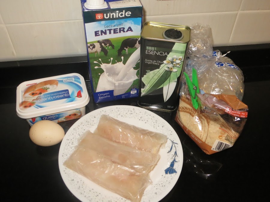 Troceamos el pan y lo mojamos en la leche. Troceamos y ponemos la merluza en una picadora, trituramos hasta obtener una pasta y luego le añadimos el queso crema, la leche con el pan mojado y un par de cucharadas de pan rallado. Si queréis podéis añadirle perejil, ajo en polvo…