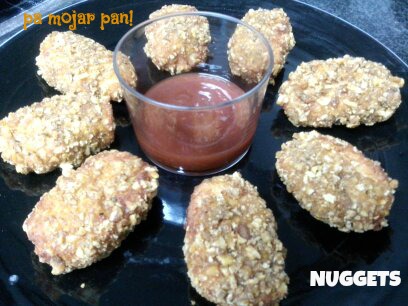En un bol cascamos los huevos. Los salamos, batimos y procedemos a empanar los nuggets con los kikos, que nos darán un toque muy original. (si no disponemos de kikos los podemos empanar con cereales o bien con pan rallado….a nuestro gusto)