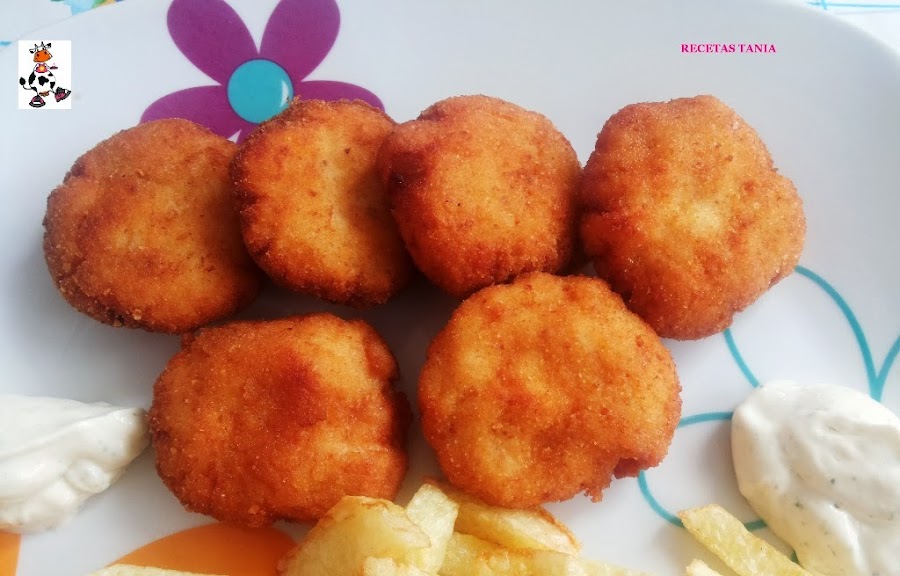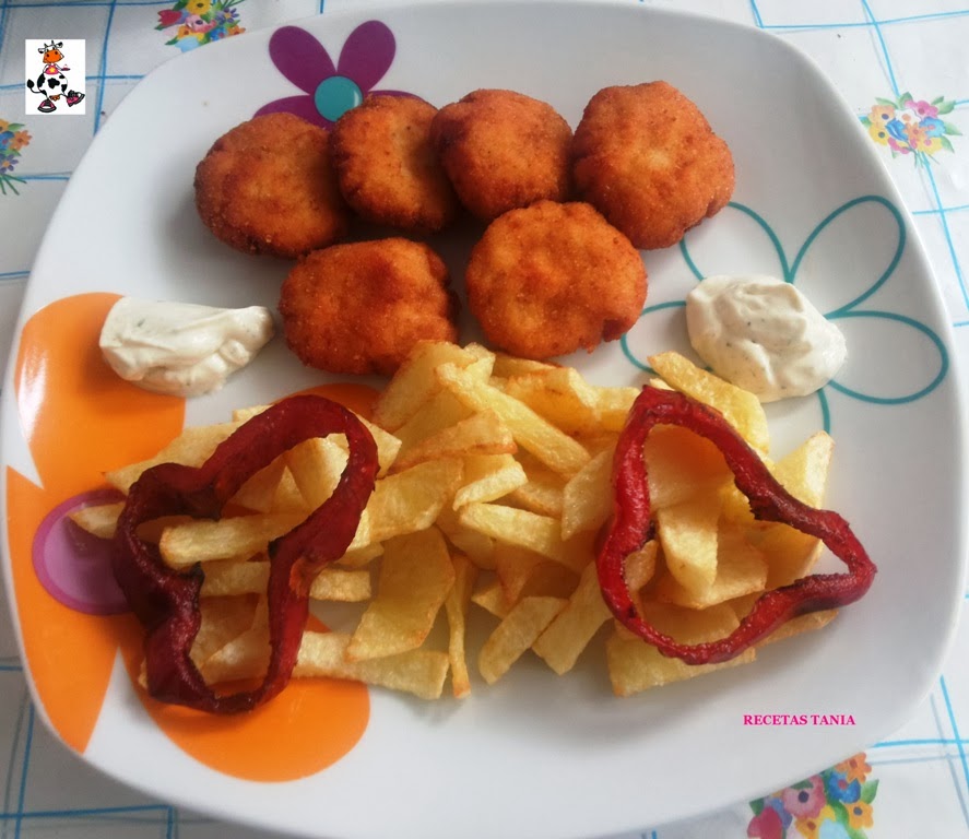 Trituramos la pechuga de pollo y lo ponemos en un bol,añadimos los quesitos triturados, la rebanada de pan de molde bañada en leche y sal al gusto. Mezclamos muy bien con la ayuda de un tenedor. En un plato ponemos harina,en otro pan rallado y el otro un huevo batido. Hacemos la forma de los nuggets y los pasamos primero por harina, después por el huevo batido y finalmente por el pan rallado. Los freímos en abundante aceite caliente, hacemos unas papas fritas, el pimiento lo hacemos rodajas y los freímos. Emplatamos y acompañamos de la salsa de que más nos guste. En mi caso hice un alioli :D