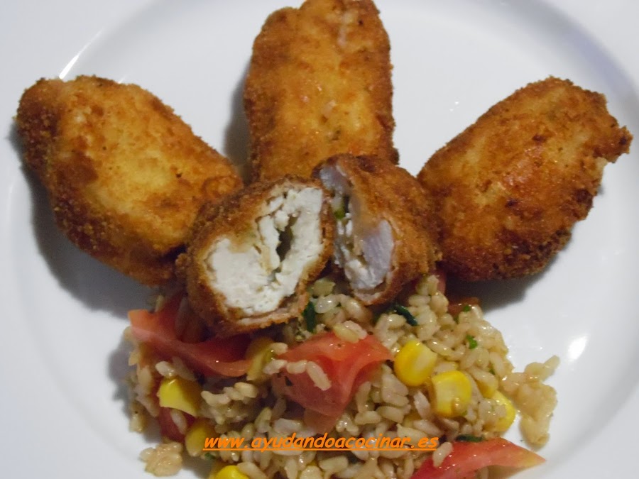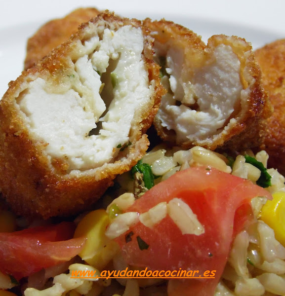 Es muy habitual acompañar este tipo de alimentos fritos, con otros ingredientes fritos, siendo la estrella absoluta "Las Patatas Fritas", pero yo me he decantado por una ensalada, algo rápido y sencillo.... En concreto una ensalada de arroz integral con tomate, maiz y perejil, que nos da un aporte de frescor, un extra de fibra y recorta las calorías de nuestro plato.