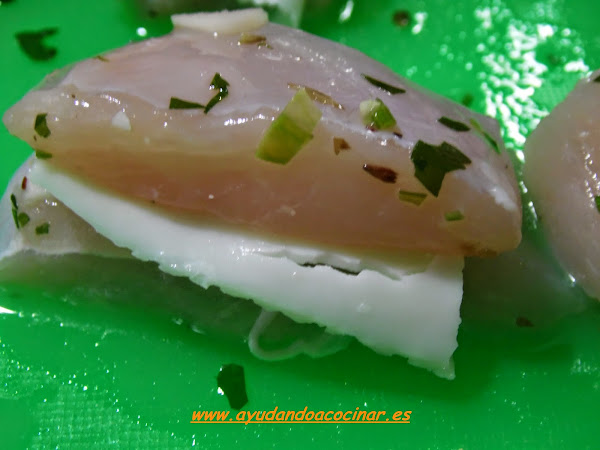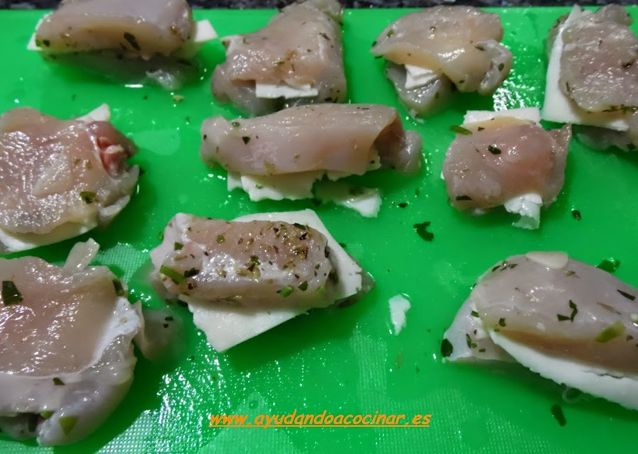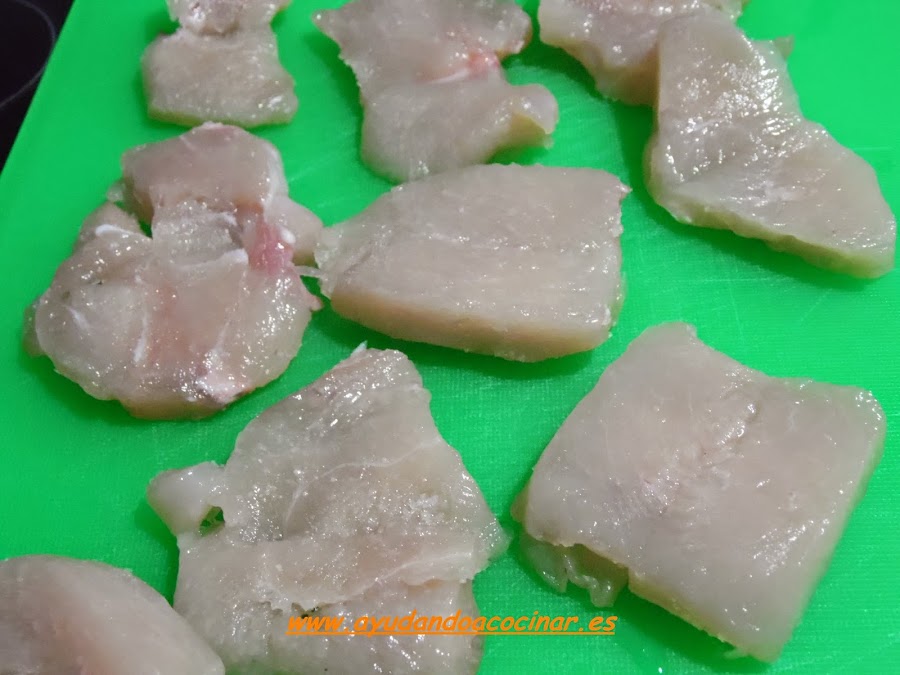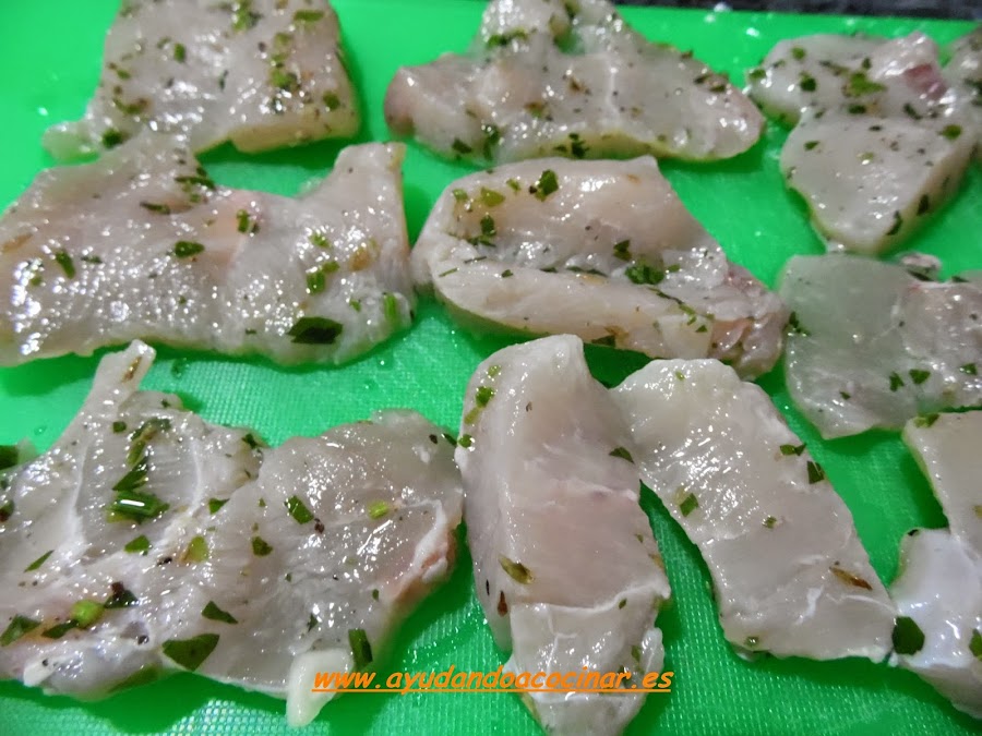 Cortar la pechuga en filetes y después en trozos del tamaño que más os guste. A mi me gusta grandecitos y abrir los trozos en forma de libro.