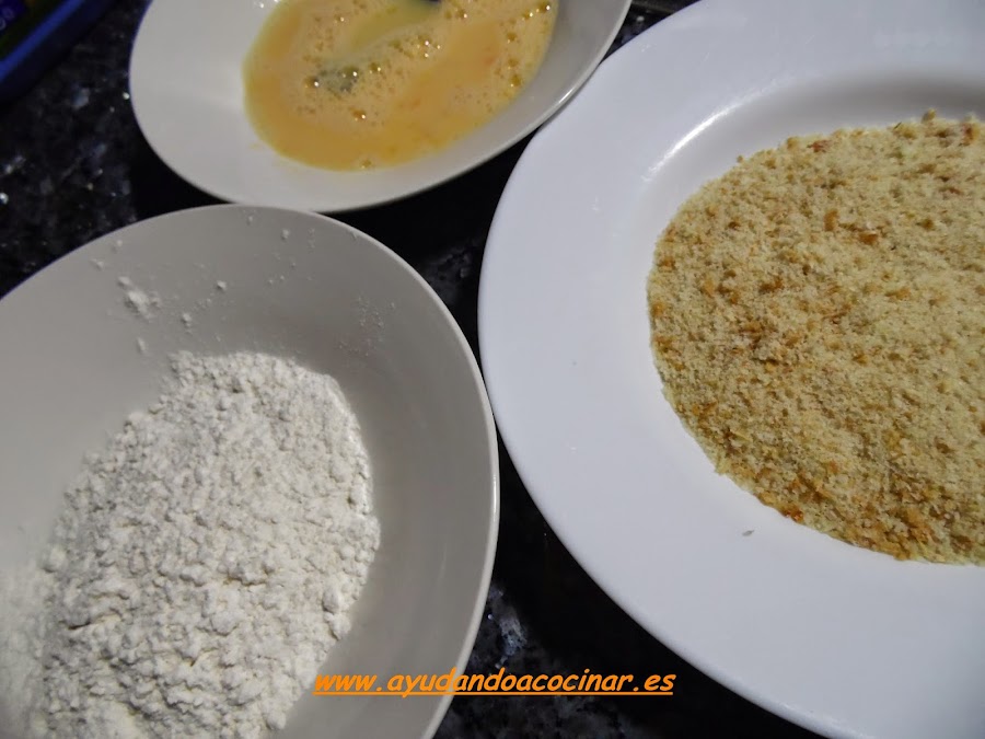 Preparar tres recipientes: uno con harina, otro con huevo batido y un pizca de sal y un ultimo con pan rallado.