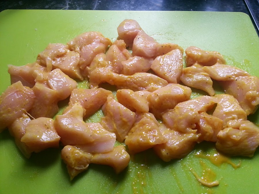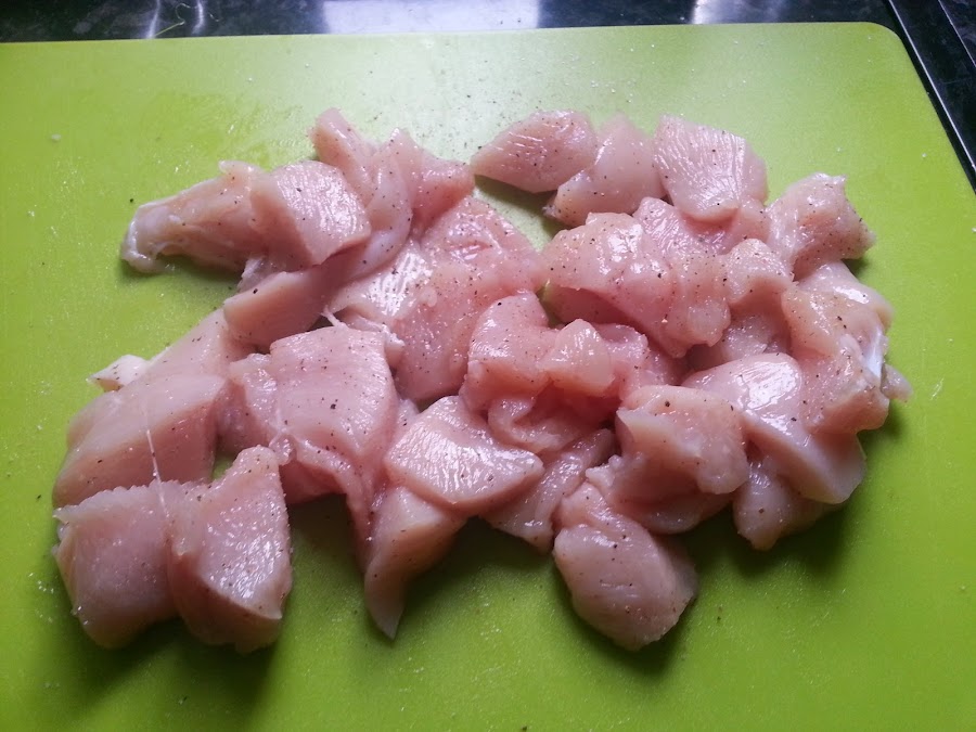 Cortamos las pechugas en trozos y salpimentamos.