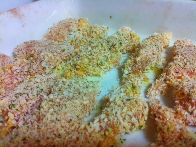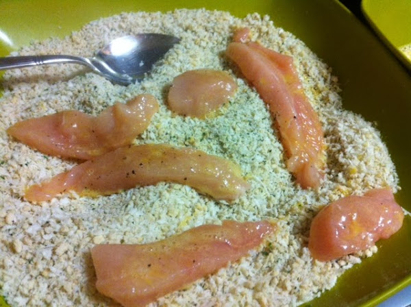 Ahora, cojer una tira de pollo, pasarla por el huevo batido, empanarla con la mezcla y colocar en la fuente. Así sucesivamente con todas las tiras, colocándolas todas extendidas en la fuente, sin que queden amontonadas una encima de otra.