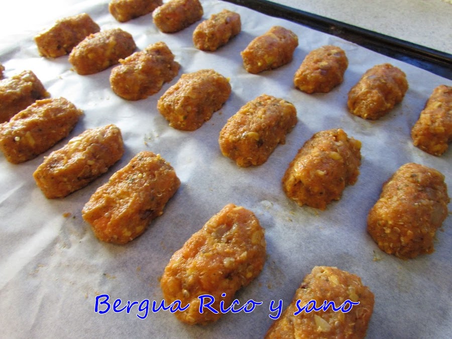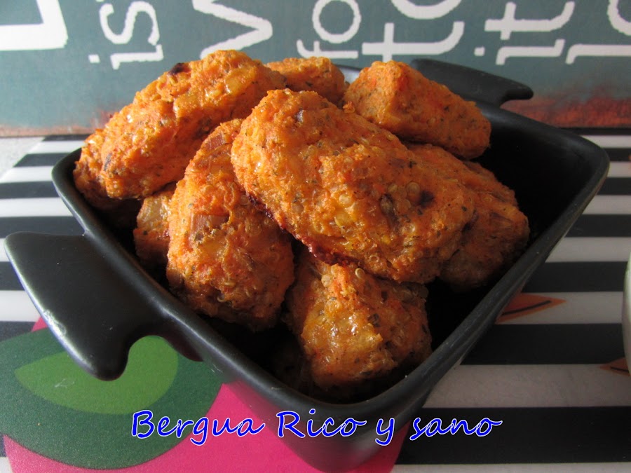 Me estuve planteando el nombre; hubiera preferido no recurrir a un anglicismo, pero lo cierto es que la palabra "nugget" ha ganado la batalla en España para hablar de "nuggets de pollo" y esta receta de "nuggets" de zanahoria es una alternativa vegetariana ideal.