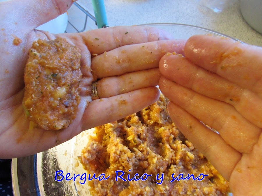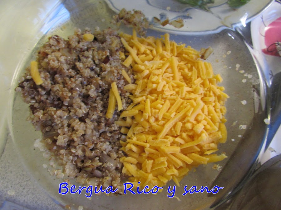 5. Ya podemos mezclar la quinoa, el puré de zanahoria, la cebolla, el queso, sal, pimienta, pimentón y un huevo batido. Mezclamos y dejamos reposar en la nevera durante unos 15-20 minutos.