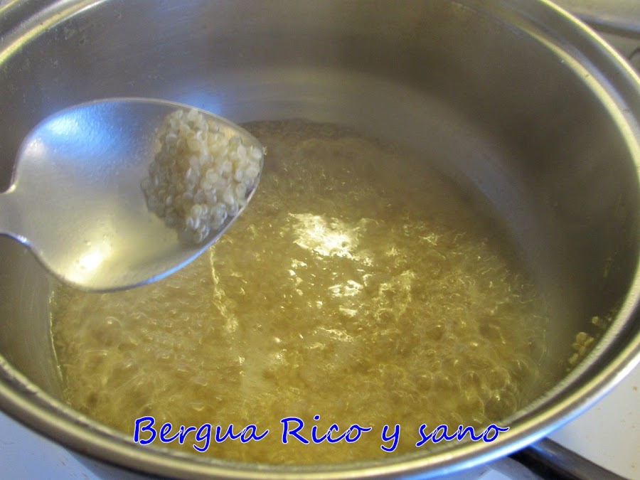 1. Cocemos la quinoa con agua y un poco de sal. Hervimos durante 12-15 minutos; la medida de agua es dos partes de agua por una de quinoa. Hay que controlar que no se quede sin agua. Después escurrimos y reservamos.