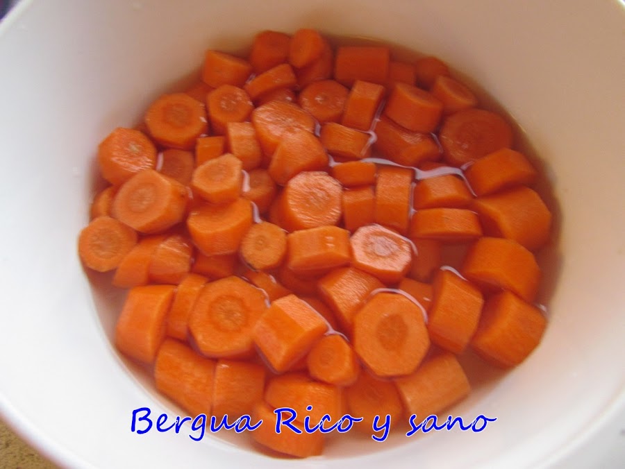 2. Mientras tanto, vamos a preparar las zanahorias. Primero las pelamos y las cortamos en trocitos de tamaño más o menos uniforme. Luego las vamos a cocer un poco; no demasiado (no queremos que se deshagan), pero que se les pueda clavar un cuchillo sin mucha resistencia. Una forma sencilla y rápida de hacerlo es cubrirlas con aprox. 120 ml de agua (que todos los trozos queden en parte cubiertos) y darles 10 minutos en el microondas.