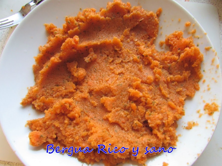 3. A continuación desechamos el agua de la zanahoria y trituramos con la batidora de mano o lo que tengamos. Yo eché el perejil también en este paso para mezclarlo. Lo ideal es extender la zanahoria triturada en un plato y dejar que se enfríe un poco, para que no se derrita el queso ni se cuaje el huevo al mezclar. En Dinamarca no es problema; abro la ventana y se hiela jeje