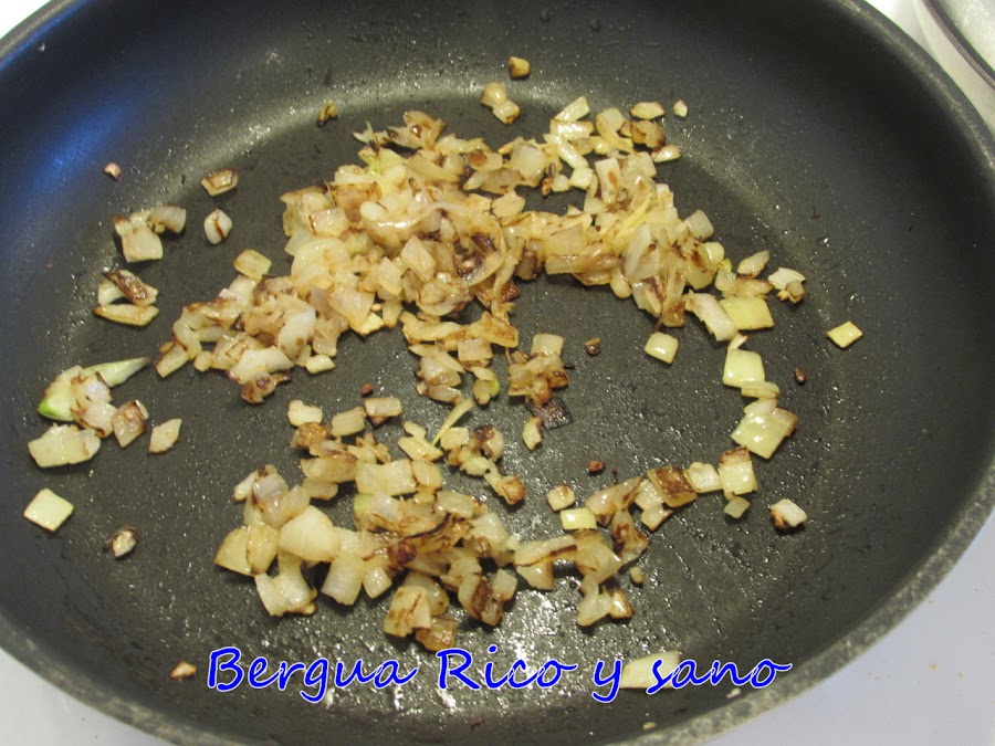 4. Mientras la quinoa y la zanahoria se enfrían un poco, aprovechamos para pochar la cebolla. La picamos, prensamos el diente de ajo y pochamos en un poco de aceite en una sartén; con la tapa puesta para que el vapor acelere el proceso. Reservamos.