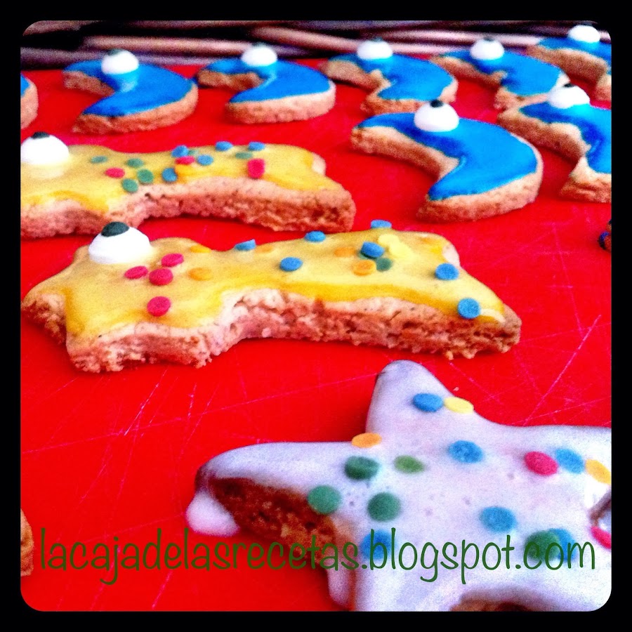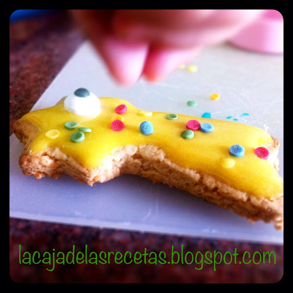 Extender la masa con un rodillo en una lámina de 1/2cm de grosor y recortar las galletas redondas de unos 8cm de diámetro (mi versión tuneada incorpora cortes naviedeños...). Colocarlas en la bandeja de horno forrada con papel vegetal o silicona y cocerlas a media altura a 180º unos 12-15mins (en mi horno se hacen en menos tiempo...así que no les quites ojo). Dejarlas enfriar en rejilla para decorarlas con el glaseado.