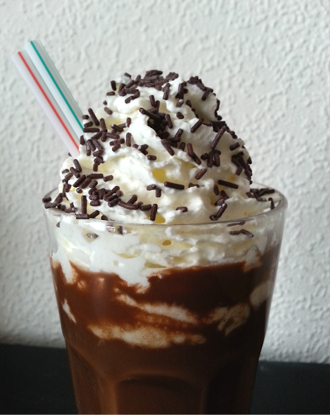 Lo pasamos a un vaso y lo decoramos al gusto. En este caso lo hemos hecho con nata (crema de leche) batida y fideos de chocolate.