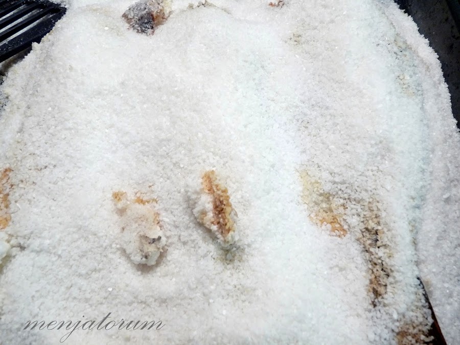Al horno a 180º durante 30 minutos, hasta que veais que la sal endurece y se dora un poquito.