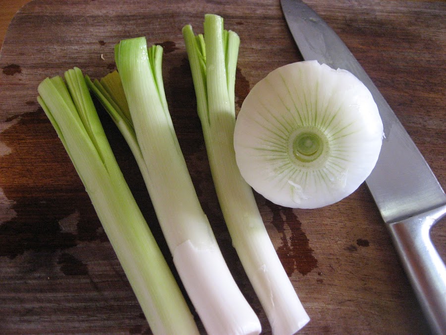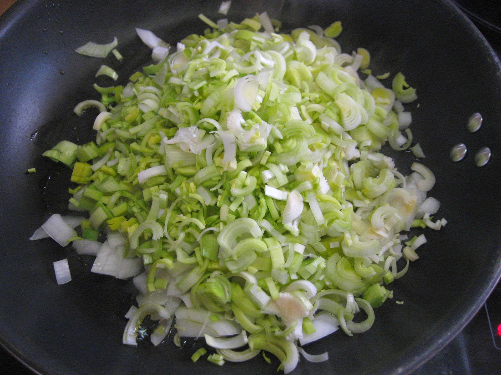 1º " Cortamos los puerros y la cebolla tierna y lo ponemos en la sartén para que se vaya pochando, a fuego lento. No queremos que nos quede muy tostada.
