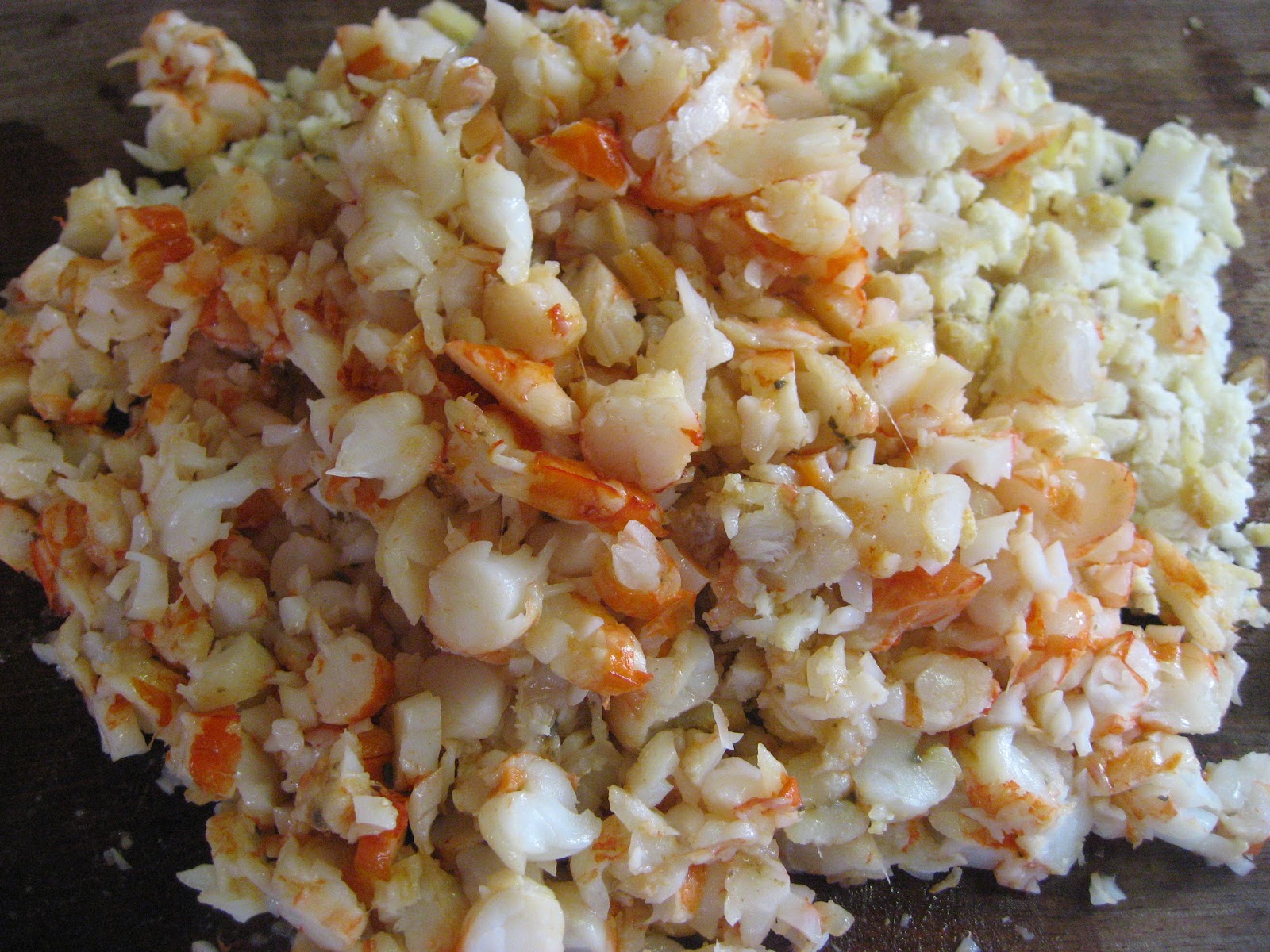 8º " Añadimos el jugo de las cabezas de las gambas, dos cazos del fumet de pescado y unas tres cucharadas soperas de crema de leche, lo mezclamos bien y se lo añadimos al picadillo que hemos hecho con el pescado y las gambas, mezclamos y listo ya tenemos el relleno.