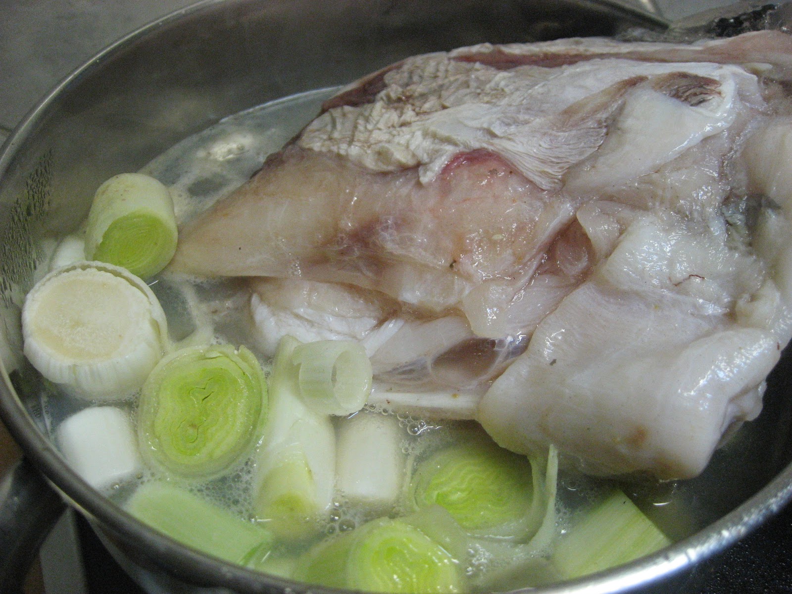 6º " Con el caldo de los mejillones, comenzaremos a hacer un fumet de pescado, para ellos utilizaremos la cabeza del Rape, dos puerros y un par de zanahorias. Dejamos que vaya reduciendo a fuego lento y vamos desespumando de vez en cuando y ya lo tenemos.