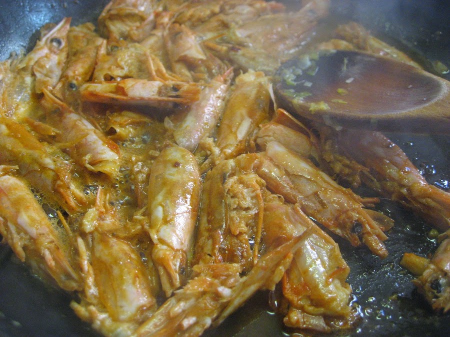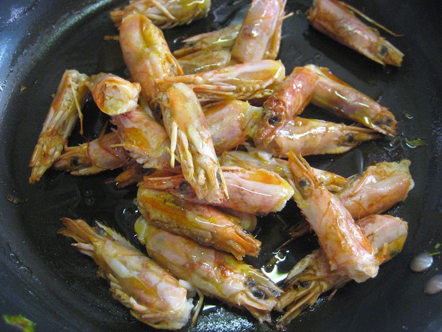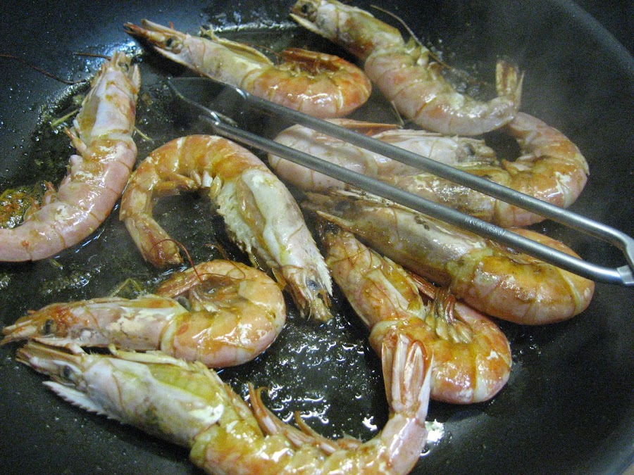3º " De la misma manera pasaremos las gambas y las reservaremos. Antes de reservarlas en el plato les quitamos la cabeza para poder quitarles todo el jugo.