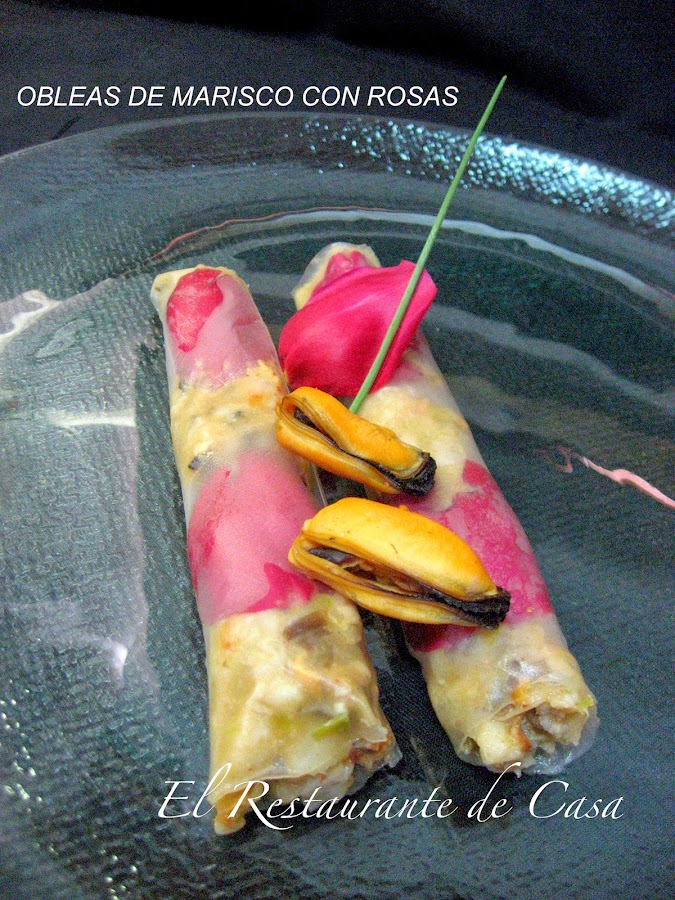 Muy importante rellenar las obleas de una en una. Pasamos la oblea por el agua, le colocamos dos pétalos de rosa a cada oblea, rellenamos con la ayuda de una manga, enrollamos la oblea y recortamos los extremos y la parte por donde hemos sostenido la oblea para pasarlas por el agua.