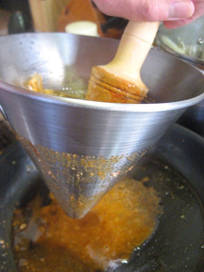 4º " Ponemos las cabezas de las gambas en la sartén con un par de ajos que habremos cortado finamente, le damos un par de vueltas y le añadimos el vermut blanco. Lo chafamos todo y lo pasamos por un chino. Reservamos el jugo que nos ha salido.