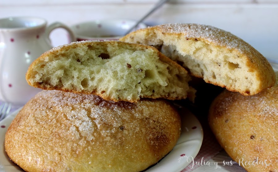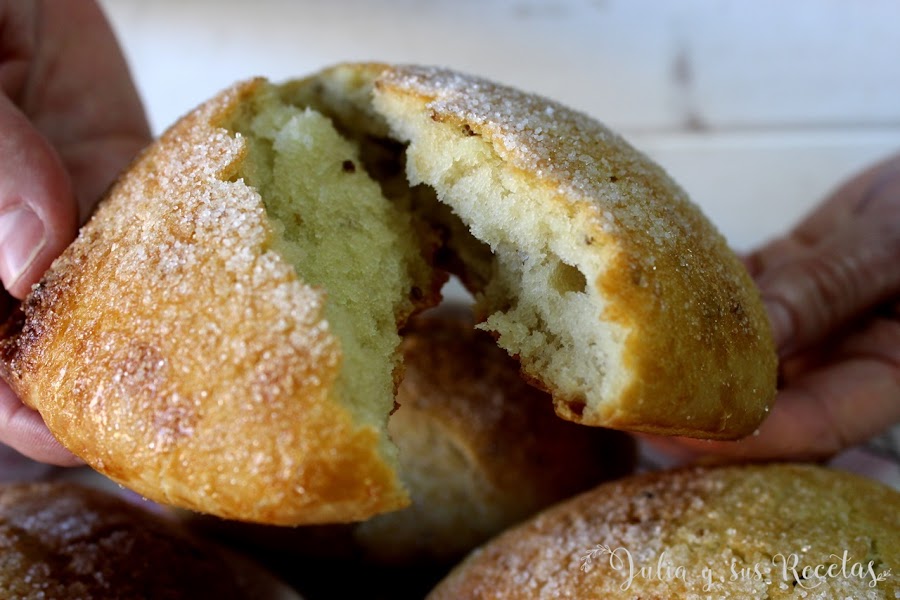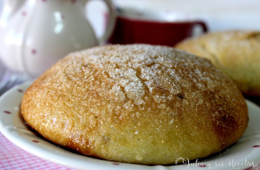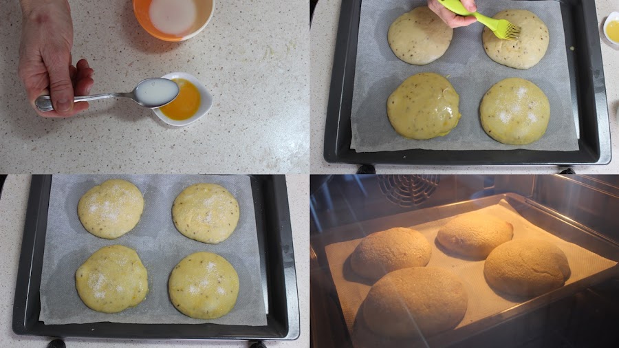 Mezclamos la yema de huevo con la cucharadita de leche y pintamos los bollitos por encima, los espolvoreamos con bastante azúcar y los horneamos, con el horno precalentado a 180ºC con calor arriba y abajo durante 18-20 minutos.