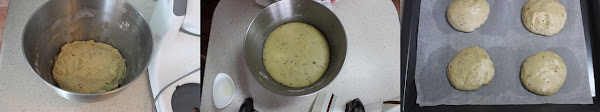 Una vez ha levado, sacamos las masa , como es muy pegajosa nos untamos las manso y la mesa de trabajo con aceite de girasol, partimos la masa en 4 partes iguales y formamos los bollitos. Los dejamos en la bandeja de horno cubierta de papel de horno y los dejamos levar hasta que doblen su volumen.