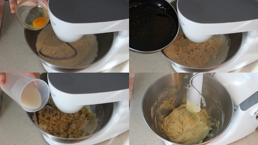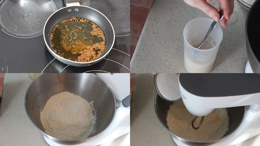 En la cubeta de la amasadora o en un bol, ponemos la harina, añadimos el azúcar y la sal, mezclamos y añadimos el huevo, el aceite con la matalahúga y el agua con la levadura.