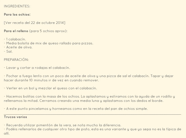 Para hoy he preparado la versión rellena de los ochíos, que sinceramente, no se cual me gusta más. Si rellenos o sin nada, están demasiado ricos y cada finde me supero más, tanto que Miriam (mi amiga y compi ubetense) se emociona cada vez, y siempre dice: ¡¡Esto si que son ochios!! Para ella cada vez hago mejor la receta de su tía y es todo un orgullo. Aunque siempre me decía que no conseguía el color bien por el pimentón, pero el finde estuve comprando provisiones para mi despensa, y pasando por la sección de especias me encontré de frente con el auténtico pimentón de la vera, el que se usa en Úbeda para hacer este manjar. Y sí, esta vez borde la receta, menuda diferencia, el olor, el sabor, el color... un sin fin de sensaciones, definitivamente me declaro una verdadera enamorada de este pan, y no creo que encuentre otro igual, me recuerda tanto al Coc (es un pan típico de Vistavella, el pueblo de mi abuela paterna) lo comía de pequeña, y puedo decir que esta hornada si cerraba los ojos casi me transportaba a la panadería del "Carrer del forn", la que solíamos ir a comprarlo... mmm que bueno por dios!!