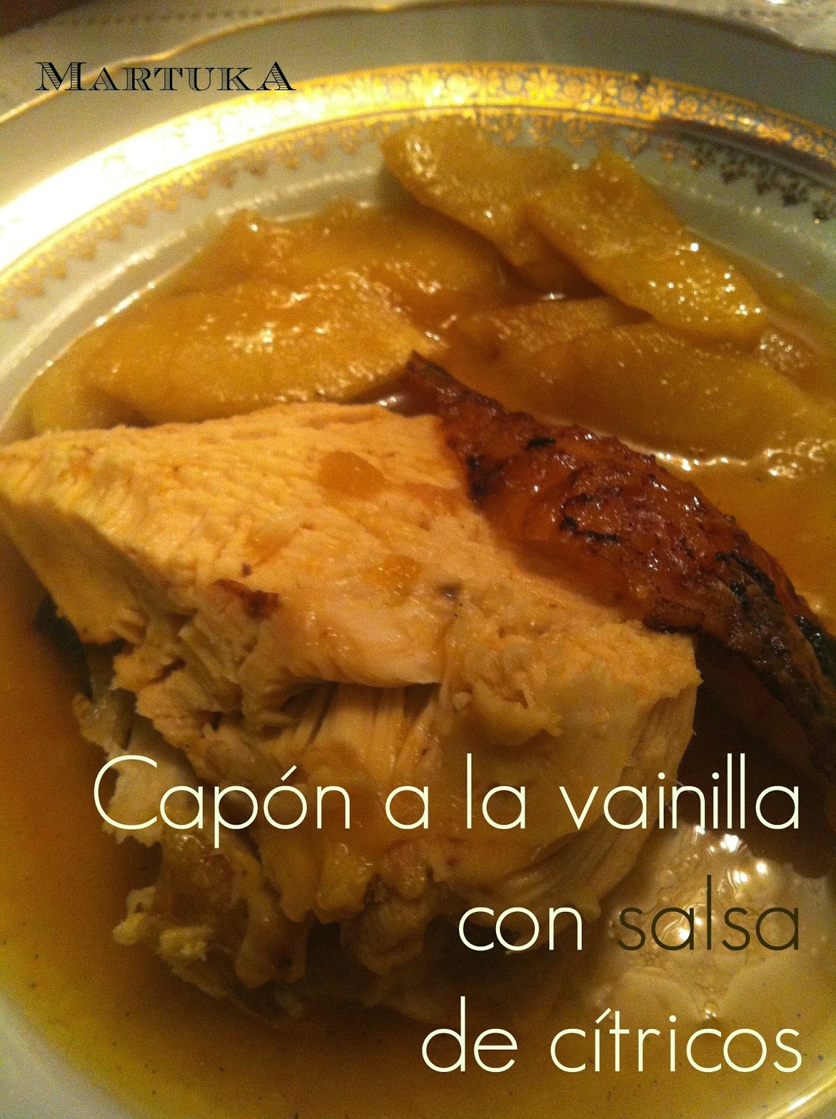 Y termino con las aves. Esta receta es de mi cuñada Mª José Pozas, y la cenamos el pasado año en Nochebuena: capón a la vainilla con salsa de cítricos (pincha aquí para ver la receta)