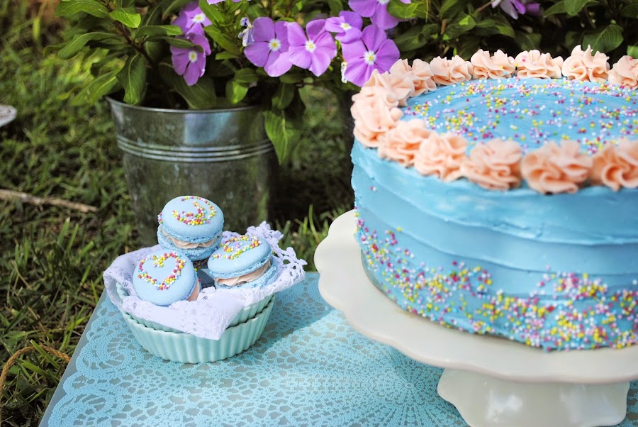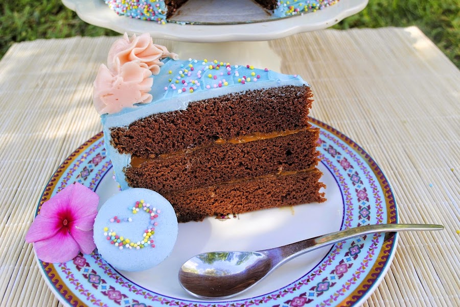 También llevé unos macs a juego como podeis ver, pero esa será otra historia...jijiTarta de Chocolate rellena de Dulce de Leche y Suisse Meringue Buttercream de Vainilla (de Veracruz, México).