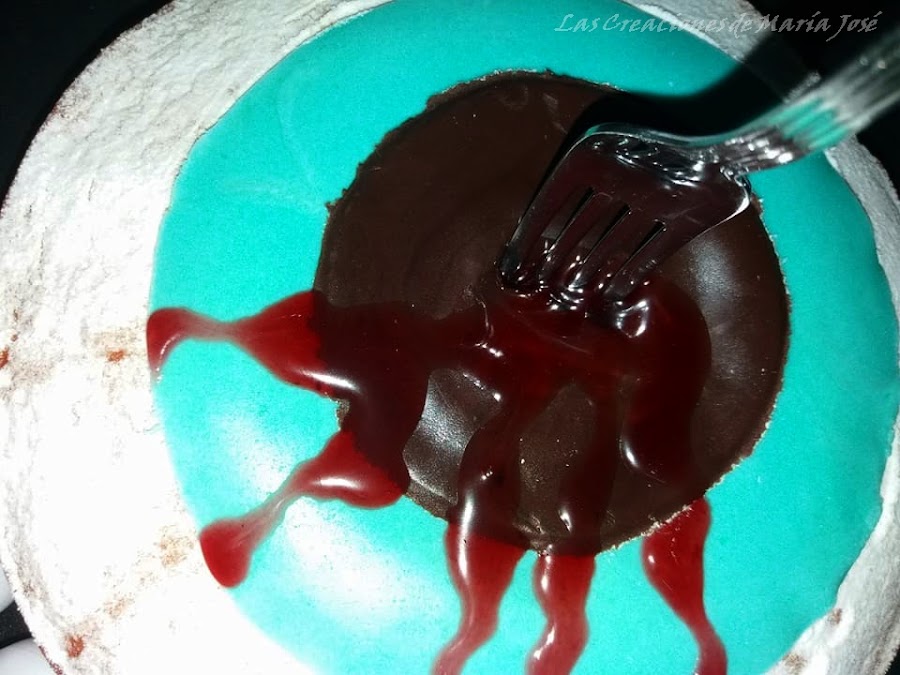 Hemos hecho este ojo entre mi marido y yo, yo hice el bizcocho y él se encargo de la decoración. Las cosas en equipo siempre salen mejor. Espero que os guste es simple pero no quedo bien chulo.
