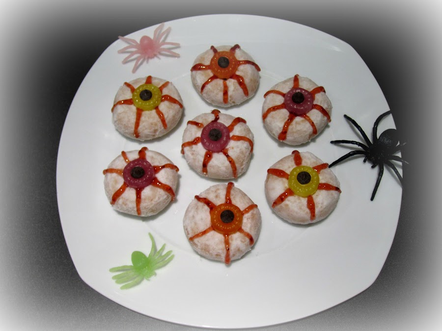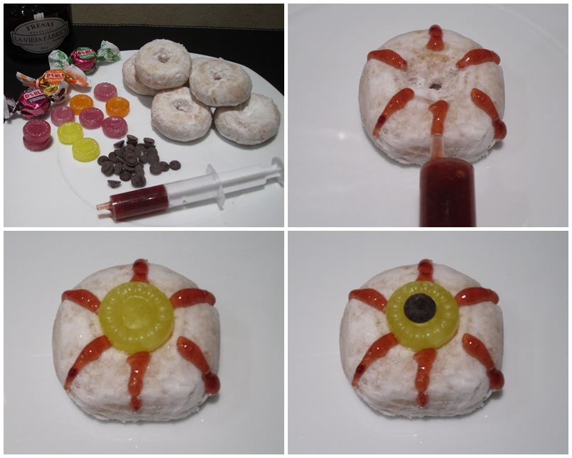 La "sangre" de los ojos la haremos con la mermelada de fresa, para ello, la pondremos en un jeringuilla (es fácil de introducir, removemos la mermelada para que esté más suelta y aspiramos con la jeringuilla)