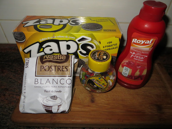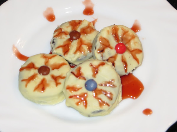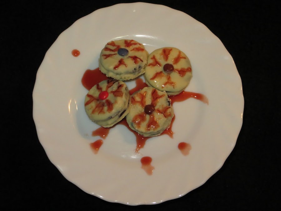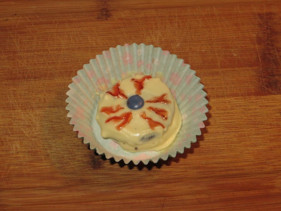 Lo primero que hacemos es derretir el chocolate al baño maría o al microondas, si lo hacéis en el microondas deberéis tener mucho cuidado ya que se quema con facilidad, así que ponerlo a baja potencia durante cortos periodos de tiempo. Una vez derretido bañáis las galletas, les ponéis el lacasito a modo de ojo y las metéis al frigorífico.