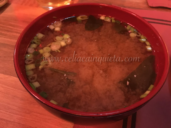 En Okashi Sanda he aprendido que la Sopa Miso no se toma con cuchara (siempre la he tomado así en todos los restaurantes japoneses a los que he ido). Se toma bebida y los "tropezones" (tofu, algas...) se comen con palillos. Esto me lo enseñó Leo que es un encanto y siempre está ahí para echarnos una mano en lo que necesitemos.