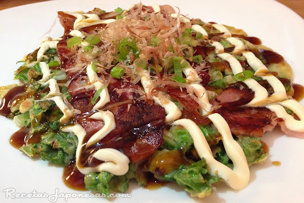 7. Dale la vuelta de nuevo y extiende la salsa okonomiyaki y la mayonesa sobre el. Puedes espolvorear por encima si deseas katsuboshi (escamas de bonito) o jengibre beni-shoga.