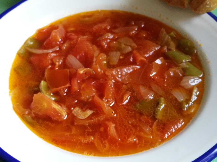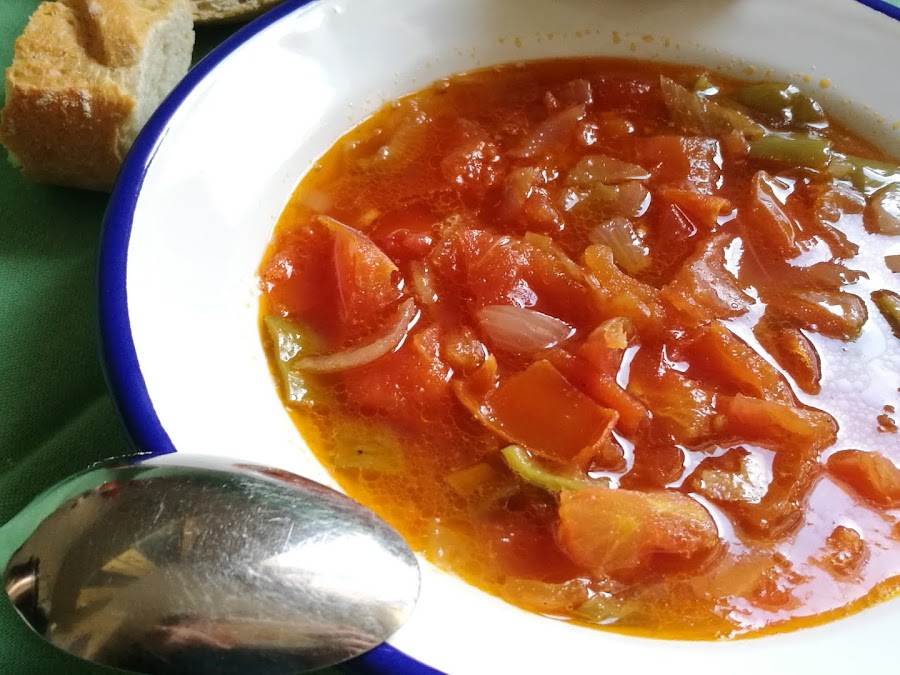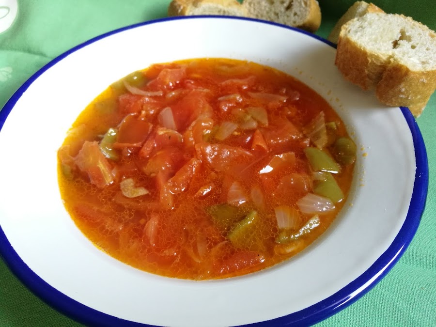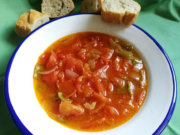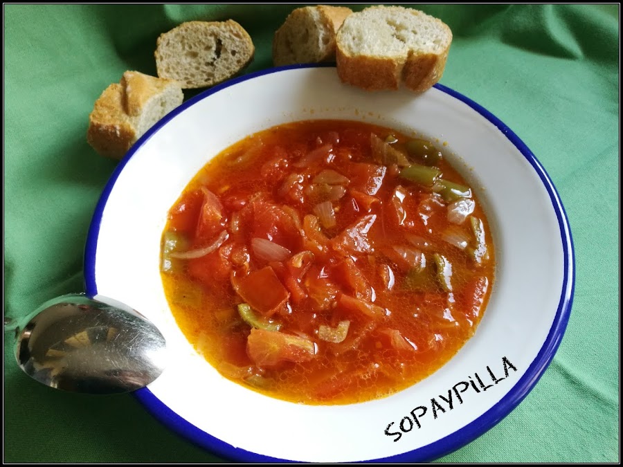 Hoy me tenéis que disculpar...no recuerdo dónde vi esta receta, aunque fué un amor a primera vista. Primero por ser un plato típico de menorca, (y no lleva sobrasada ni queso) y segundo, porque es como un gazpacho deconstruido . Como me encanta el gazpacho!!