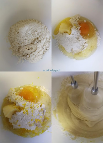 En un bol, ponemos la harina, el azúcar y la ralladura de limón, el huevo, la masa madre, la sal y añadimos la leche con la levadura. Mezclamos todo con las varillas hasta tener una masa homogénea.