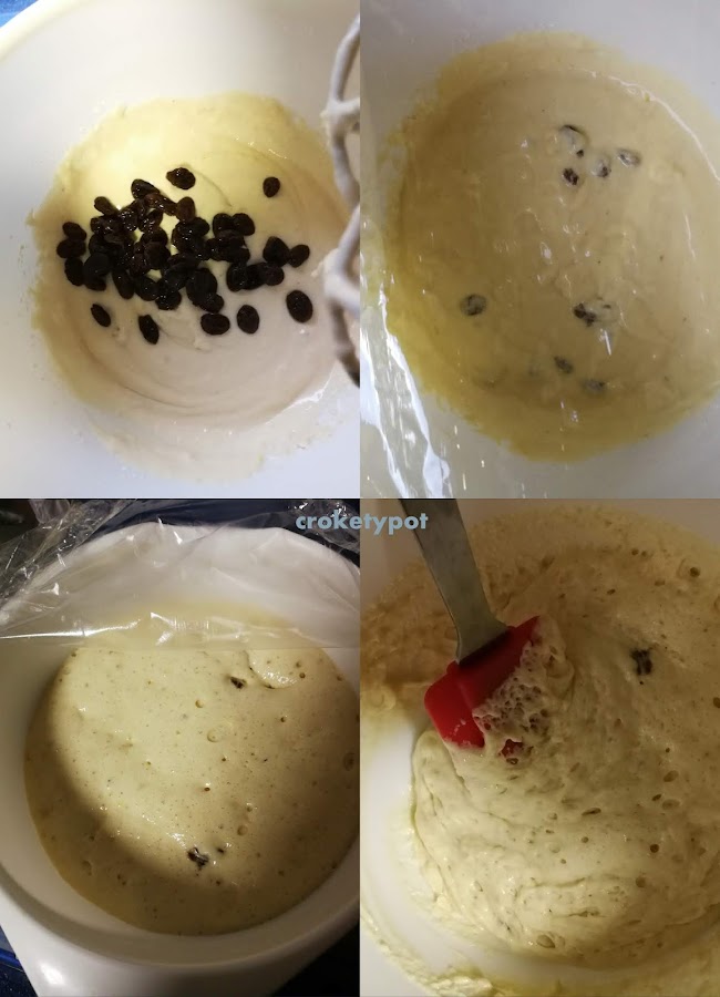 Escurrimos las pasas y las mezclamos. Tapamos con un film y dejamos reposar a temperatura ambiente hasta que duplique su volumen, unos 20 minutos según temperatura ambiente. Cuando ya lo vemos crecido removemos y se deja que se crezca de nuevo.