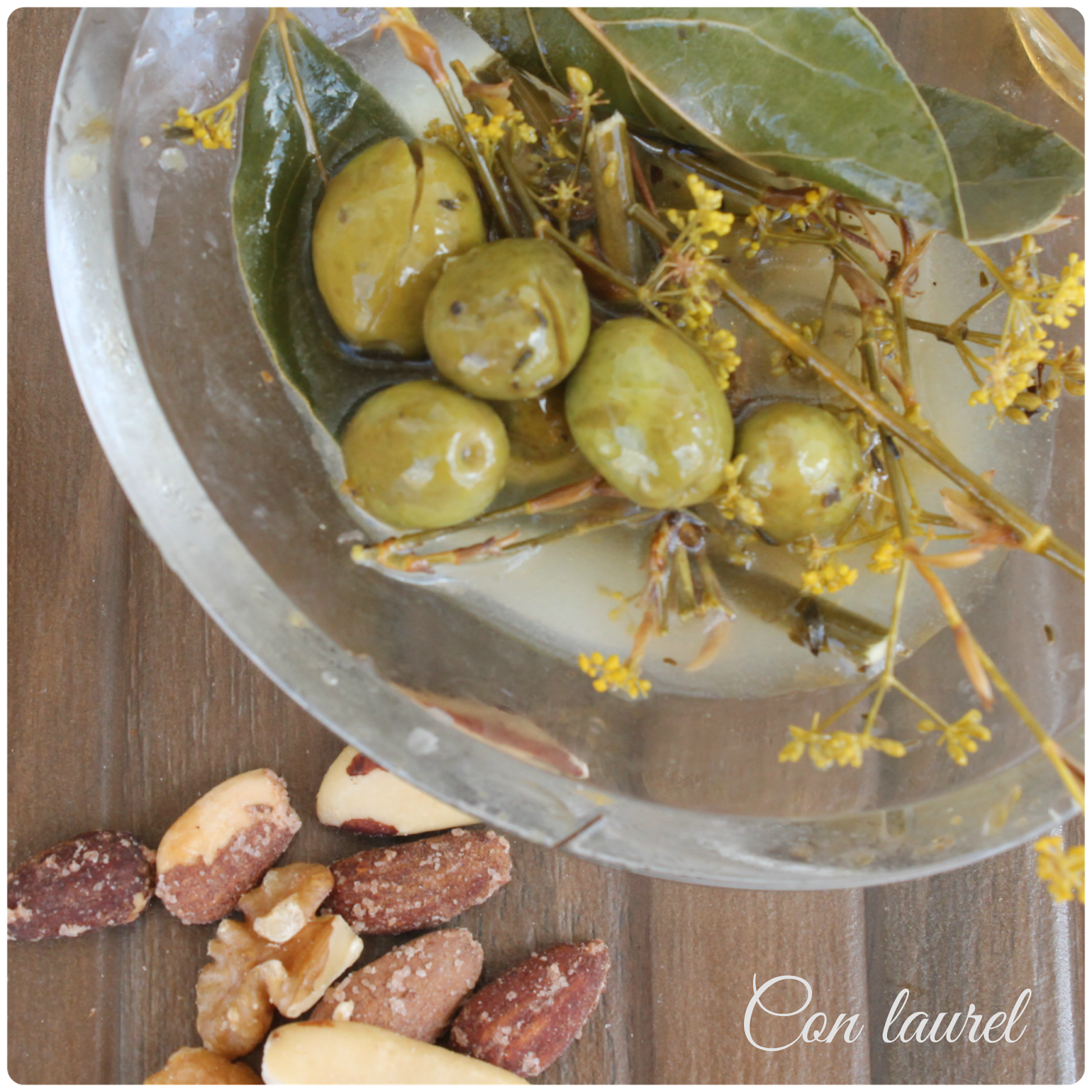- Echamos dos o tres hojas de laurel, dientes de ajos partidos por la mitad, hinojo, tomillo y orégano junto con las olivas.