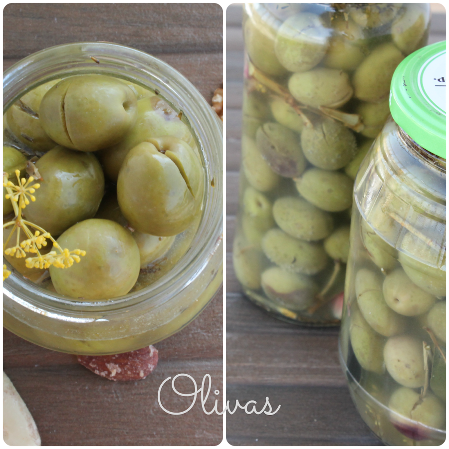 Cogemos las olivas y las cortamos con un cuchillo. Echamos a un recipiente y las tenemos dos días en agua y sal, cambiando el agua cada día, para quitarle el amargor de las olivas.
