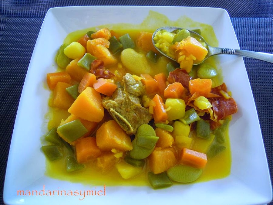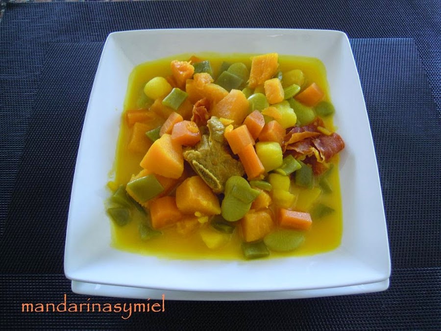 Limpia y trocea las patatas, las judías verdes y la zanahoria en trozos no muy grandes. Haz lo mismo con la calabaza pero pártela en trozos un poco más grandes que el resto de las verduras.